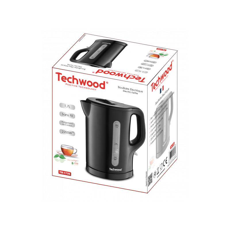 Capacité 1,7 Litre Bec verseur avec filtre amovible et lavable Arrêt automatique à ébullition Protection contre la surchauffe Couvercle de sécurité Alimentation: 220-240V~ 50/60Hz Puissance: 1850-2200W