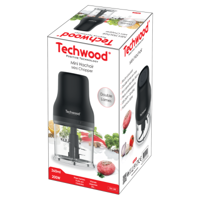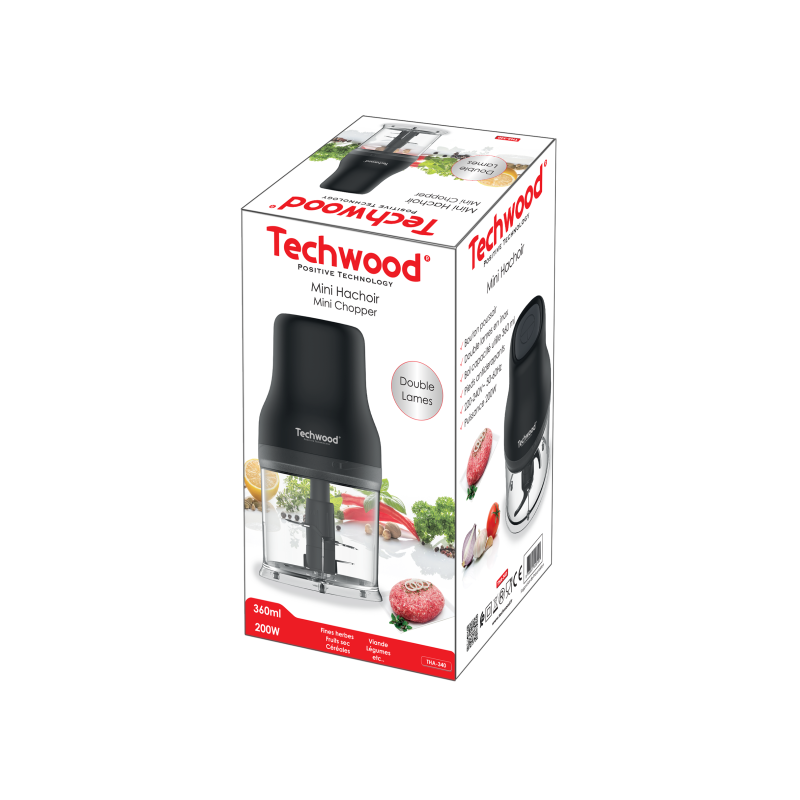 Bouton poussoir Double lames en inox (2 lames en haut et 2 lames en bas) Bol plastique capacité : 500ml Pieds antidérapants Alimentation : 220-240V ~ 50-60Hz Puissance : 200W