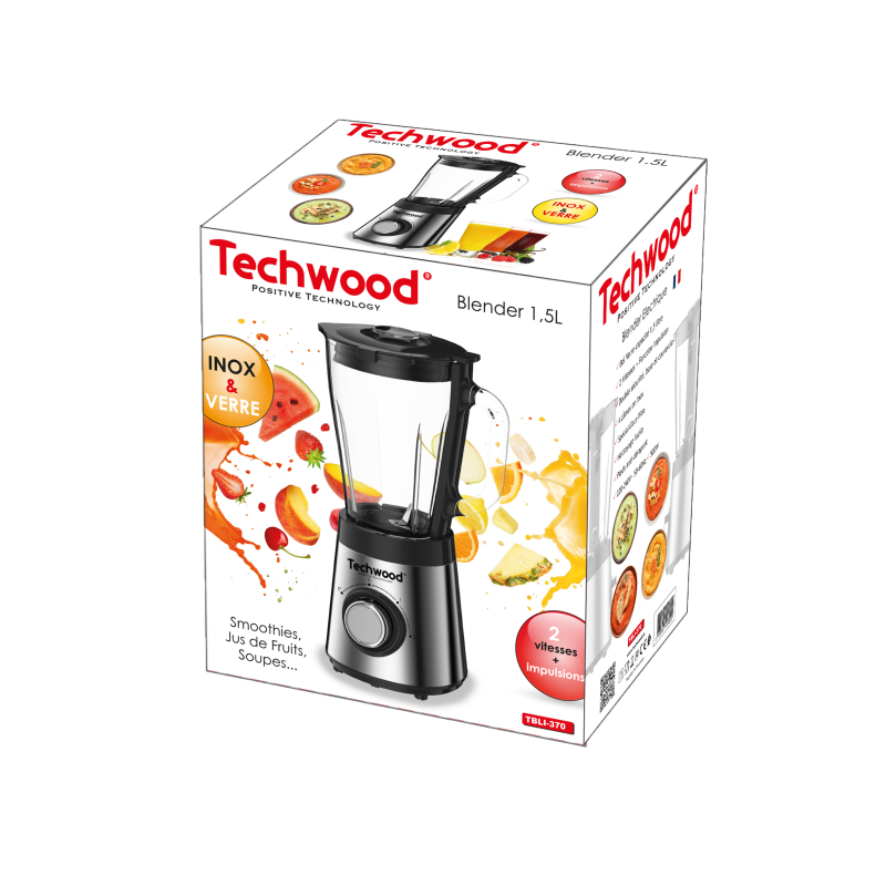 Bol Verre capacité 1.5 Litre 2 Vitesses + Fonctions impulsion Double sécurité, base et couvercle 4 Lames en Inox Spécial glace Pilée Nettoyage facile Pieds anti-dérapant Alimentation : 230V ~ / 50-60Hz Puissance : 500W
