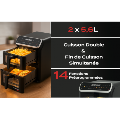 Capacité totale de 11,2 L (2 cuves de 5,6 L, soit environ 3,5 kg de frites) – Thermostat réglable de 50 à 200 °C – Minuterie de 1 à 60 minutes – Panneau de contrôle tactile digital LED – Cuisson intelligente pour synchroniser les deux zones – Double cuisson possible avec même température et durée sur les deux zones – 12 fonctions préréglées : Frites, Viande, Pilons, Steak, Gâteau, Crevettes, Poisson, Pizza, Légumes, Poulet, Préchauffage, Réchauffage – Technologie à air chaud haute vitesse – Jusqu’à 80 % de matières grasses en moins – Alimentation 220–240 V ~ 50/60 Hz – Puissance : 2600–3000 W
