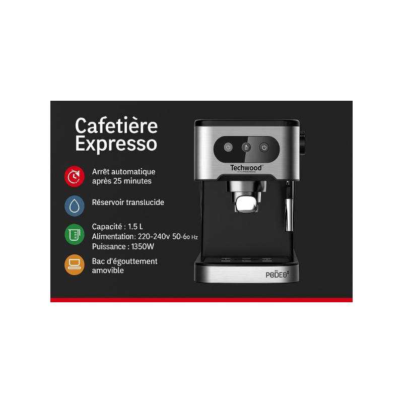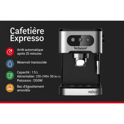 Marque : Techwood Puissance : 1350W Couleur : Noir Capacité du réservoir : 1,5 litre Pression de la pompe : 20 bars Compatibilité : café moulu et capsules Caractéristique : Arrêt automatique