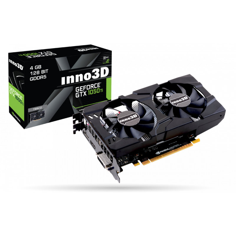 Carte graphique Inno3D GeForce GTX 1050 Ti Twin X2 - 4 Go de mémoire GDDR5 dédiée - Fréquence du chipset 1290 Mhz - Fréquence boostée 1392 Mhz - Interface PCI Express 3.0 16x - HD Ready - 1x HDMI 2.0b - 1x DVI-D - 1x DisplayPort 1.4 - 195 x 100 mm - Garantie 1 an