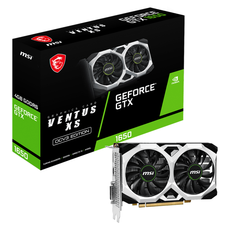Carte graphique MSI NVIDIA GeForce GTX 1650 D6 VENTUS XS OCV3 - Interface: PCI Express x16 3.0 - Performances Boost: 1620 MHz - Vitesse de la mémoire: 12 Gbit/s - Mémoire: 4 Go GDDR6 - Bus mémoire: 128 bits - 1x DisplayPort (v1.4a) - 1x HDMI 2.1a - 1x DL-DVI-D - Prise en charge HDCP - Consomation d'énegrie: 90 W - Connecteurs d'alimentation: 6 broches x1 - Alimentation recommandée: 300 W - Affichages maximaux: 3 - TECHNOLOGIE G- SYNC - Résolution numérique maximale: 7680 x 4320 - Dimensions: 179x112x42mm - Poids: 480g - Garantie 1 an