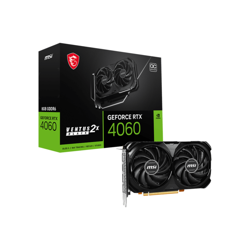 Carte Graphique MSI NVIDIA GeForce RTX 4060 VENTUS 2X BLACK 8G OC - Interface: PCI Express Gen 4x 8 - Performances extrêmes: 2505 MHz (MSI Center) - Performances Boost: 2490 MHz - Vitesse de Mémoire 17 Gbit/s - Mémoire 8 Go GDDR6 - Mémoire Bus 128 bits - 3x DisplayPort (v1.4a) - 1x HDMI (2.1a) - Consomation D'énergie 115W - Connecteurs D'alimetation 8 broches - Dimenssions: 199 × 120 × 41 mm - Poids: 546g - Affichages Maximum: 4 - TECHNOLOGIE G- SYNC - Résolution Maximale Numérique: 7680 x 4320 - Garantie 1 an