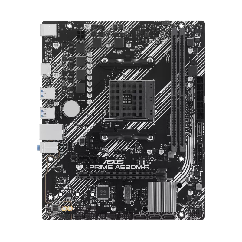Carte mère micro-ATX ASUS PRIME A520M-R - Facteur de forme: Format micro-ATX - Socket AM4 pour AMD Ryzen série 5000/série 5000 G/série 4000 G/série 3000/série 3000 - Jeu de puces AMD A520 - Mémoire: 2x DIMM DDR4, (max 64 Go) - 1x HDMI 2.1 - 1x Emplacement M.2 - 4x ports SATA 6 Gb/s - 1x Ethernet Realtek 1 Go - 4x ports USB 5 Gbit/s - 2x ports USB 2.0 - 3x prises audio - 1x 1 port clavier PS/2 (violet) - 1x port souris PS/2 (vert) - Dimensions: 23.6 cm x 19.3 cm - Garantie 1 an