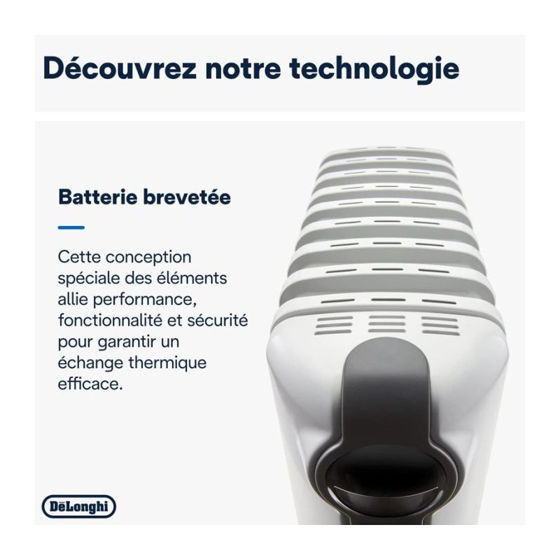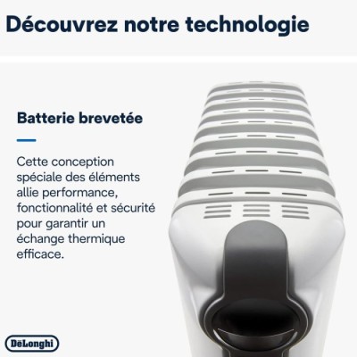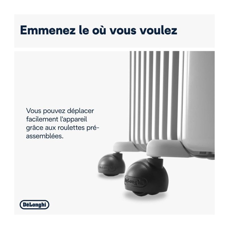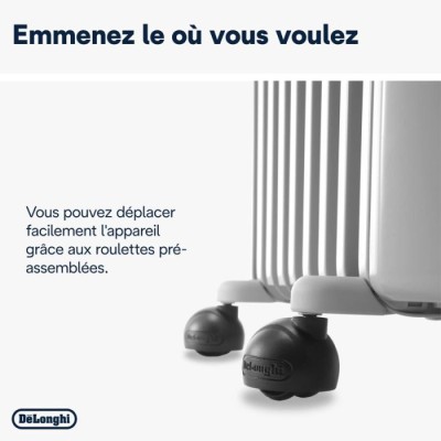 Radiateur Bain d'Huile DELONGHI - Puissance: 2500 Watts - Nombre d'Éléments: 12 éléments - 3 niveaux de chauffe - Pour les chambres jusqu’à 75 m³ - Contrôles Mécanique - Thermostat d’ambiance - Thermostat de sécurité - Fonction anti-gel - Rangement du cordon - Poignée et roulettes multidirectionnelles - Alimentation: 220-230 V ~ 50-60 Hz - Dimensions: 65 x 59,2 x 16 cm - Couleur: Blanc - Garantie: 1an