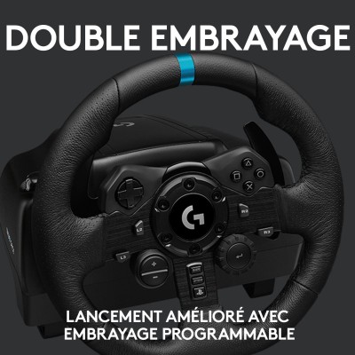 Volant de course avec pédales Logitech G G923 - Volant à rotation 900 degrés - Retour de force à deux moteurs avec technologie TrueForce - Protection contre les surchauffes - Commandes de jeu sur le volant - Pédale de frein non linéaire pour un meilleur contrôle - Système antidérapant breveté - Repose talon antidérapant texturé - Dimensions du volant (HxLxP) : 270 x 260 x 278 mm pour 2.25 kg - Dimensions du pédalier (HxLxP) : 167 x 428.5 x 311 mm pour 3.1 kg - Compatible PC et PlayStation 5 / PlayStation 4 - Garantie: 1 an