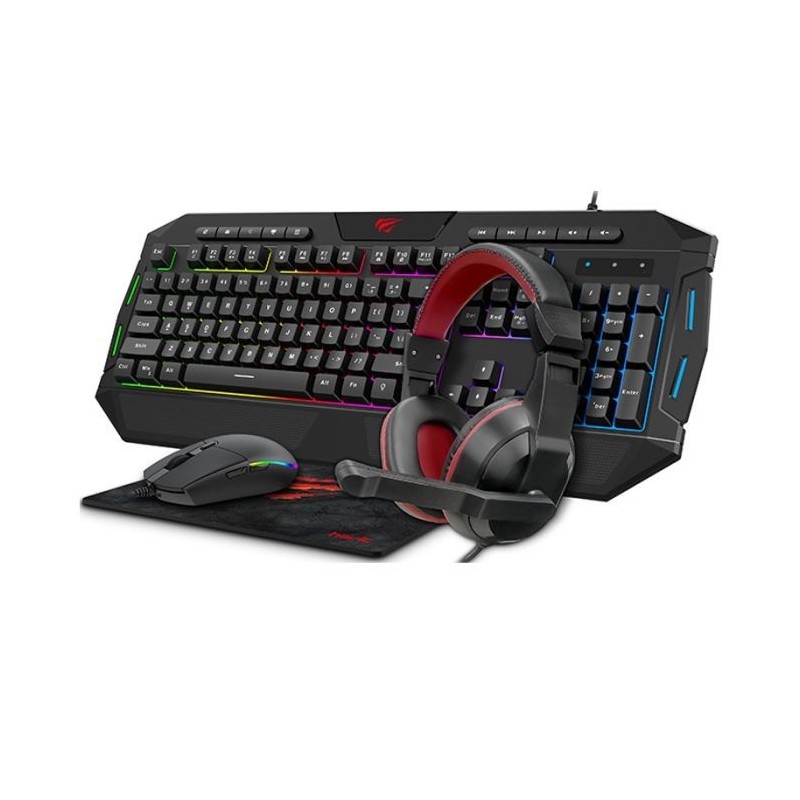 PACK Gaming 4 en 1 HAVIT KB501CM RGB: Souris: Capteur Optique: 800-1200-1600-2400 DPI - Ergonomie optimisée avec revêtement antidérapant - Clavier: Design de jeu attrayant – 19 touches anti-ghosting pour un contrôle fluide et précis - Fonctions multimédia intégrées – 10 touches standards accessibles via la touche FN - Casque: Sobre, élégant et performant – Haut-parleur magnétique de 40 mm offrant une qualité sonore supérieure - Le bandeau rétractable s’ajuste facilement à toutes les formes et tailles de tête - Tapis Tapis de souris: Surface en tissu à mailles fines de haute qualité pour une glisse optimale – Base en caoutchouc antidérapante assurant une parfaite stabilité – Bords renforcés pour une durabilité accrue - Rétro-éclairage RGB - Couleur: Noir - Garantie: 6 mois