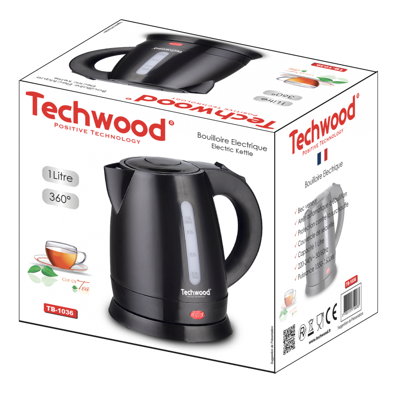 Bouilloire Techwood TB-1036 - Puissance 1350W-1600W - Capacité 1L - Bec verseur - Bec verseur - Protection contre la surchauffe - Couvercle de sécurité - Garantie 1 an
