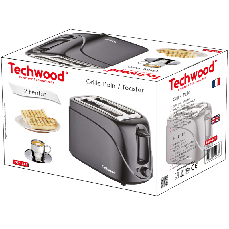 Grille Pain 2 Fentes TECHWOOD TGP-246 - Puissance: 700W - Touche “Arrêt” immédiat - Contrôle du brunissage - Ejection automatique ou manuel - Tiroir ramasse miettes - Rangement du cordon sous l’appareil - Alimentation 220-240 V~ 50Hz - Couleur Noir - Garantie 1 an