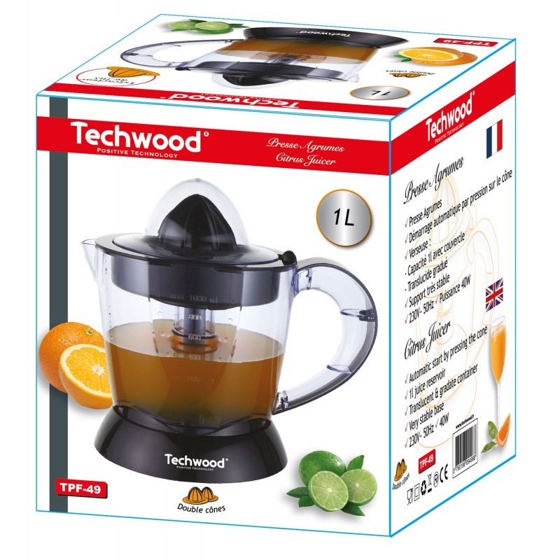 Presse-agrumes - Puissance: 40W - Capacité: 1L - Presse fruits 2 cônes - Démarrage automatique par pression sur le cône - Double sens de rotation - Bol verseur translucide gradué - Livré avec couvercle transparent - Alimentation : 230V ~ 50Hz - Garantie: 1 an