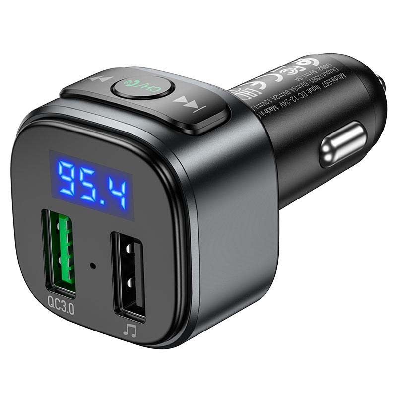 Connecteur : USB - Nombre de ports : 2 ports - BT v5.0, puce JL AC6966 - Entrée : DC12V-24V - Sortie : USB 1 - 18 W (pour QC/FCP/AFC) - USB2 – Tension : 5V / 1.5 A - Prend en charge BT - lecture de clé USB - Principe de fonctionnement : le téléphone mobile se connecte à l'émetteur via BT, l'émetteur se connecte au haut-parleur de la voiture via FM - Dimensions : 74x37x36mm - Poids : 31g - Couleur : Noir