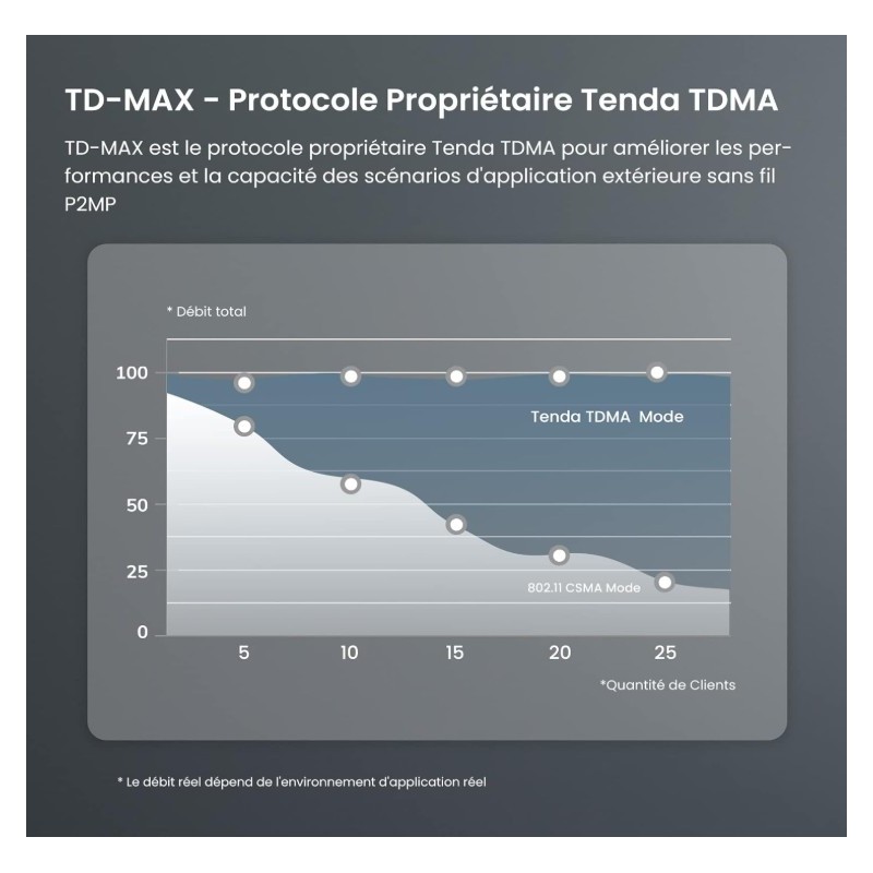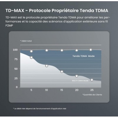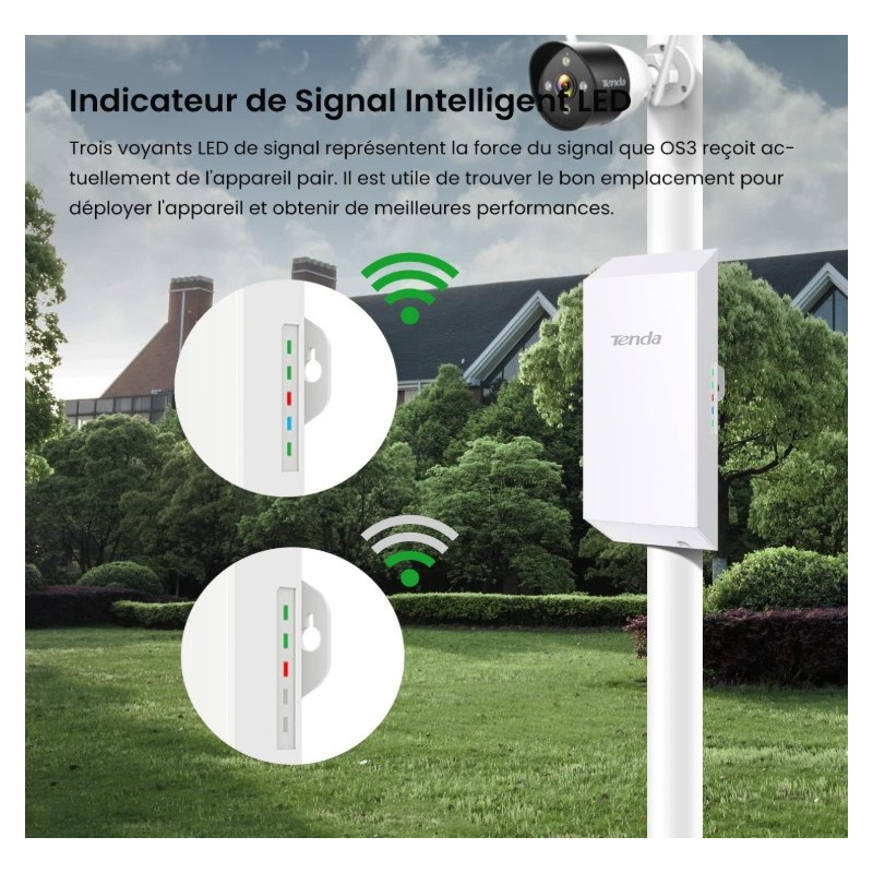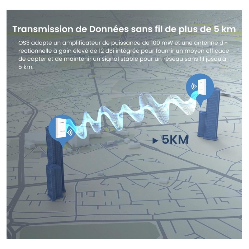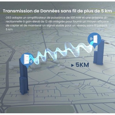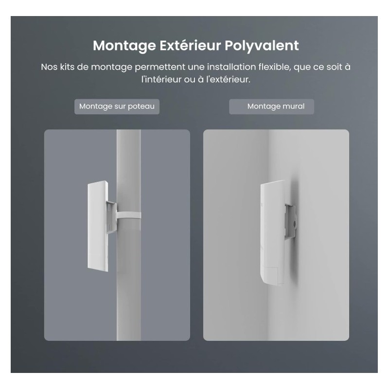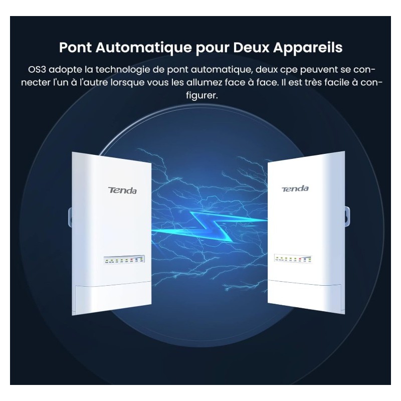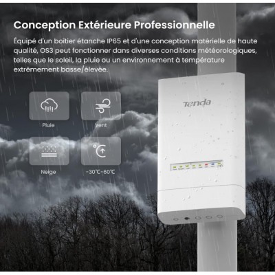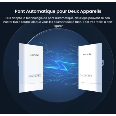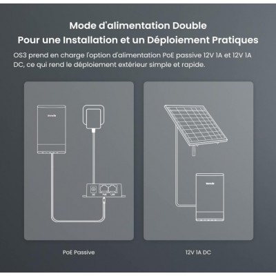 Type : Point d’accès extérieur (Outdoor CPE) Fréquence : 5 GHz Norme Wi-Fi : 802.11ac Vitesse : Jusqu’à 867 Mbps Gain d’antenne : 12 dBi Portée : Longue portée & connexion stable Alimentation : PoE Passif (Power over Ethernet) Mode : Auto-Bridging Étanchéité : IP65 Waterproof Installation : Facile pour usage extérieur- Garantie : 2 ans