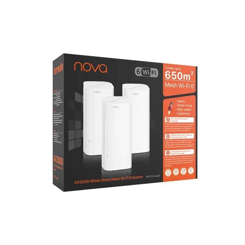 Paquet de 3 Système Wi-Fi 6 maillé TENDA Nova MX12/EX12 pour maison Connectée AX3000 - Double bande - Mode de fonctionnement : Mode routeur, mode AP - Puissant processeur à 4 cœurs de 1,7 GHz - Norme de réseau : IEEE 802.3, IEEE 802.3u, IEEE 802.3ab - Interface Ethernet: 3 ports RJ45 10/100/1 000 Mbps par nœud - Vitesse de transfert de données : 2 976 Mbps - Antennes : 4 antennes internes de 3 dBi - Pouvoir : Entrée : AC 100-240 V, 50/60 Hz , Sortie : DC 12 V ⎓ 1,5 A - Débit de données : 2,4 GHz : 574 Mbps (802.11ax) , 5 GHz : 2 402 Mbps (802.11ax) - Bouton : 1 bouton de réinitialisation, 1 bouton MESH - Dimensions : 86 x 86 x 190mm - Couleur : Blanc - Garantie : 2 ans